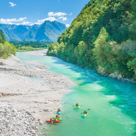 Today you will meet your English speaking hiking guide and visit the town of Bled, known as the pearl of the Alpine region. Your day begins with a short hike around Bled (difficulty: moderate; duration: approx. 3 hours). The path brings us near the banks of Lake Bled through small neighboring villages before turning into the Vintgar gorge, dug by the Radovna river. It is one of the most visited natural monuments in Slovenia. The gorge is 1,600 meters long and ends with the Šum waterfall, the largest river cascade in Slovenia. As you walk, you can admire the crystal-clear waters of the river, its rapids and ponds. At the end of the gorge you return to Bled passing villages like Zasip. Arriving in Bled, lunch at the local restaurant. In the afternoon take the traditional boat ride called “pletna” to visit the islet in the middle of the lake where you also visit the church. Overnight in Bled area in a campsite of your choice.Day 3: Soča Valley