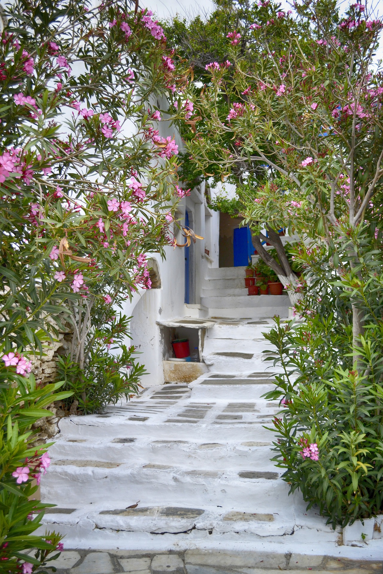 In the morning you take the public bus to Gavrio and travel per ferry to Tinos. A taxi takes you to the village Falatados in the inner land. In the afternoon you can make a round walk from Falatados. Via a kalderimi you walk to the village Myrsini and descend to the (dry) river bed of the Livada river. You can opt to return from here via another kalderimi back to Falatados and enjoy some free time or you may continue to Livada beach and return partly via the same route. It is definitely worthwhile to spend some time exploring the narrow alleys in Falatados and discover this very traditional village in your own way.